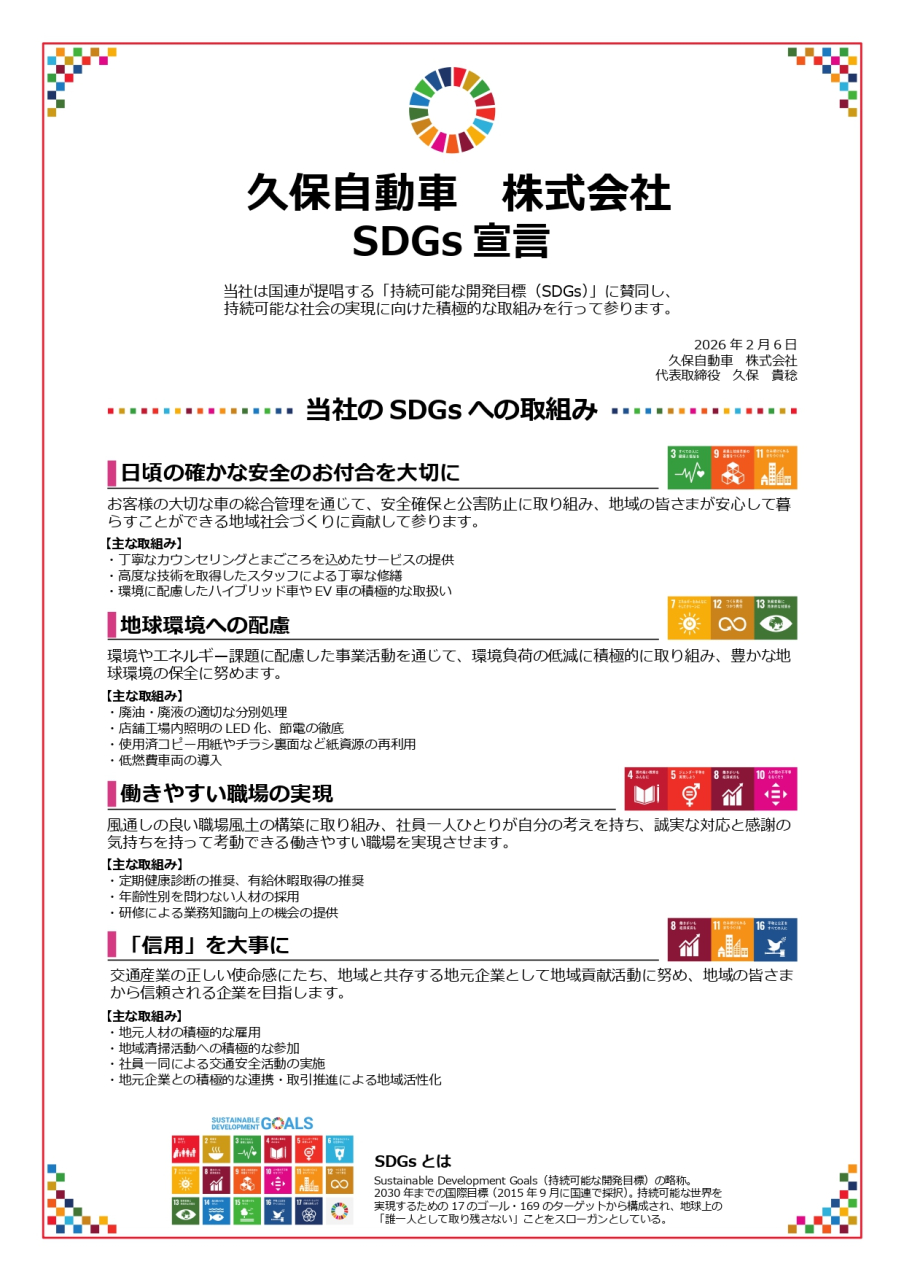 これからも、自動車販売、車検・点検・一般整備・板金塗装、損害保険、レンタカーなど皆様のお車に関するカーライフをお手伝いしていきます。